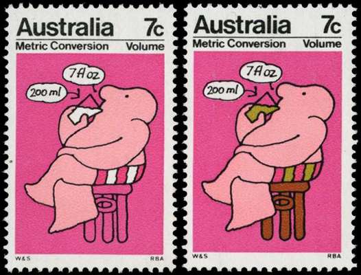1973 Metric Conversion 7ct Volume showing variety ''YELLOW-OLIVE OMITTED'', full unmounted o.g., very fine, offered with normal for comparison. SG 533a; BW 623cb