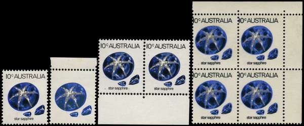 1973-79 10ct 'Star Sapphire' group all with listed varieties. We note BLACK OMITTED, lower marginal pair with TURQUOISE OMITTED and block of four PRINTED ON THE GUMMED SIDE; unmounted o.g., very fine. SG 552a-552ae; BW 648c-cg
