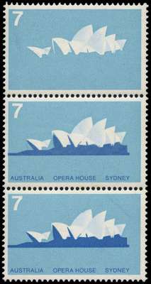 1973 'Sydney Opera House' 7ct vertical strip of three with top stamp showing variety NEW BLUE (BUILDING & INSCRIPTION) OMITTED, full unmounted o.g., a striking error, fine and scarce. SG 556a; BW 653c