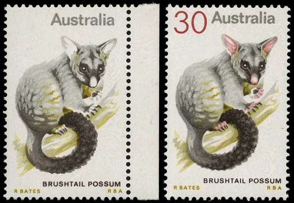 1974 30ct Brushtail Possum showing variety CARMINE-RED (FACE VALUE etc) OMITTED, full unmounted o.g., offered with normal for comparison. SG 563a; BW 662c