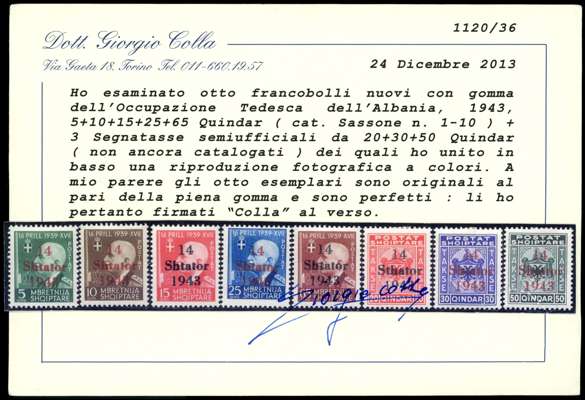 GERMAN OCCUPATION: 1943 optd on stamps of Italian Conquest set of eight, fine o.g; expertising signatures on reverse, a very rare set, which was prepared for use but not issued. Colla Certificate (2013)