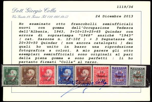 GERMAN OCCUPATION: 1943 optd on stamps of Italian Conquest set of eight, showing error ''1948'' instead of ''1943'' fine o.g; expertising signatures on reverse, a very rare set, which was prepared for use but not issued. Colla Certificate (2013)