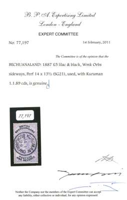1888 £5 lilac and black, superb used with lovely central "KURUMAN" cds dated "JA 1 89". Exceptional quality for this key high value. BPA Certificate (2011), SG 21