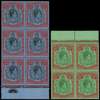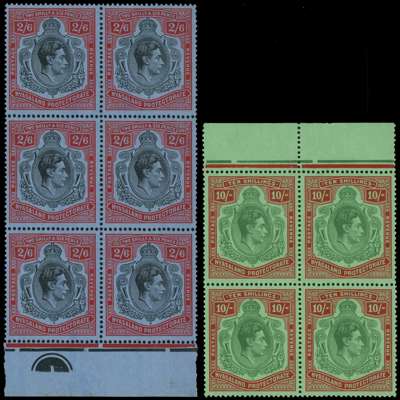 1938 2/6d lower marginal block of six with Plate 1 plug, and 10/- upper marginal block of four, unmounted o.g. SG 140, 142, £312