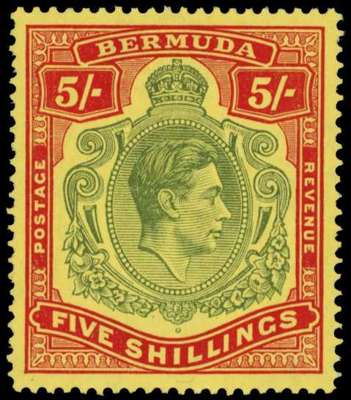 1941 5/- dull yellow-green and red on yellow paper, line perf 14¼, unmounted o.g. Really fresh. SG 118b, £275