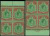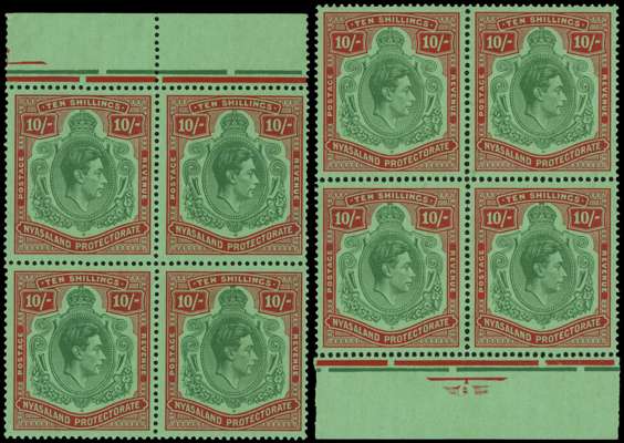 1938 10/- upper marginal block of four, unmounted o.g., #s 7-20; and a lower marginal block, #42-55, unmounted o.g. but very fragile and liable to separate into singles. SG 140, 142, £312