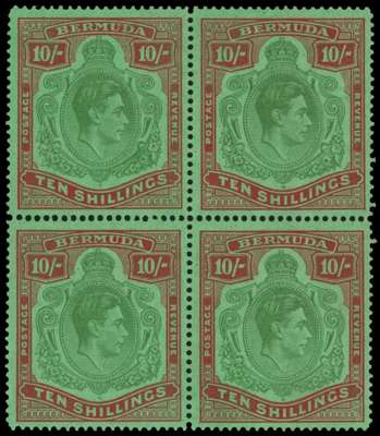 1942 10/- yellow-green and carmine on green paper, line perf 14¼, o.g. block of four, HPFs #59i broken top right scroll and 60 broken lower right scroll. Probably not hinged, but minor gum disturbances affect three stamps; some slight splitting between lower pair. Rare multiple nonetheless. SG 119b, bd, be, £6000