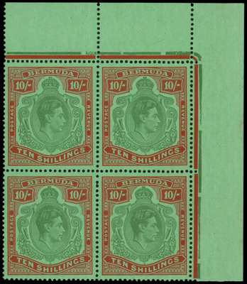 1943 10/- yellowish green and deep carmine-red on green paper, top right corner block of four, unmounted o.g. Fine, flaws include FF #11b, HPF 12b. SG 119c, £280