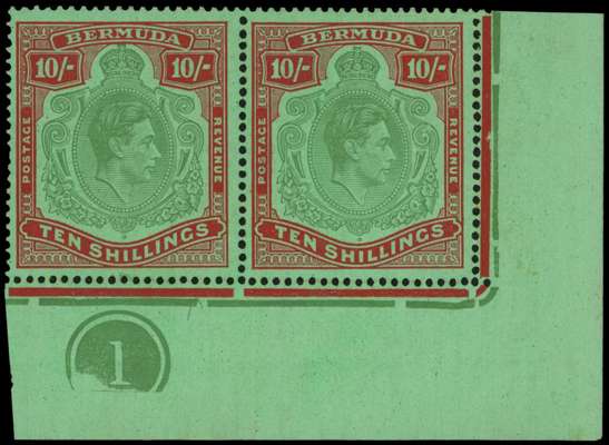 1938-53 10/- yellowish green and deep carmine-red/green, ordinary paper, perf 14 (comb), from 1943 5th printing, lower right corner horizontal pair with plate number, showing variety 'Broken lower right scroll' on R5/12, very fine unmounted o.g. Only 86 possible, and especially rare and desirable in this form and condition. SG 119ce