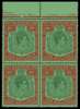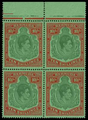 1946 10/- deep green and dull red on green paper, emerald back. Unmounted o.g. positional block of four, #s 7-20, FF #8. Fine. SG 119d, £300