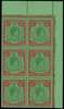 1953 10/- green and dull red on green paper, perf 13. Top right corner block of six, #s 11-36 with anticipated flaws; nice multiple. SG 119f, £240