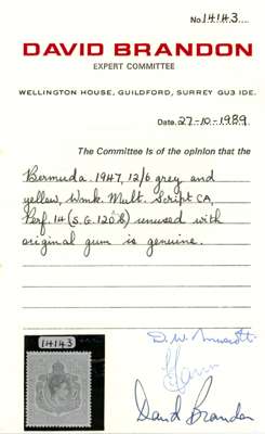 1946 12/6d grey and yellow ('lemon'), fine large part o.g. with HPF #47. Brandon Certificate (1989). SG 120d, £600