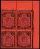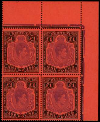 1951 £1 violet and black on scarlet paper, perf 13. Top right corner block of four, FF11 damaged left value tablet ('White Island'), very fine o.g. (lightly hinged). Rare in a positional multiple. SG 121da, £4500
