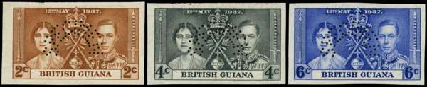1937 Coronation set of three, imperforate, perforated SPECIMEN Type D20, lightly hinged o.g. The 2ct and 4ct with small part margins at left, incompletely gummed at left. From the De La Rue archives, one of six sets produced. SG 305s-7s proofs