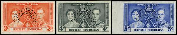 1937 Coronation set of three, imperforate, perforated SPECIMEN Type D20, lightly hinged o.g. The 5ct left marginal, incompletely gummed at left. From the De La Rue archives, one of six sets produced. SG 147s-9s proofs