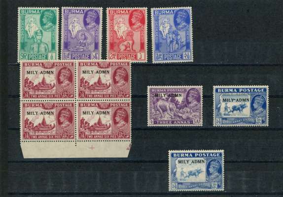 1938-40, 1945 and 1946 sets, unmounted o.g., also 1946 2a6p block with 'birds over trees', 3a6p double overprint and another with worn vignette. SG 18b-63, £393