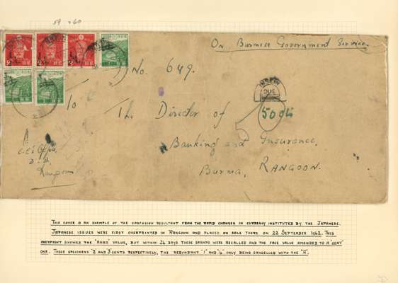 1942 Official cover to Rangoon franked by 2ct ½a on 2s bright scarlet strip of three and 3ct on ¾a on 3s green (3), tied by Insein cds with Insein Postage Due h/s at right and taxed at Two Annas. This cover is an example of the confusion resultant from the rapid change in currency instituted by the Japanese, firstly they were surcharged in Annas but within 24 days these stamps were recalled and the face value amended to Cents. Some faults to cover, still an attractive and interesting item. SG J59-J60