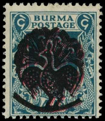 1942 KGVI 4a greenish blue type 1 opt of Myaugmya in black on red, brilliant o.g. very fine. SG J6