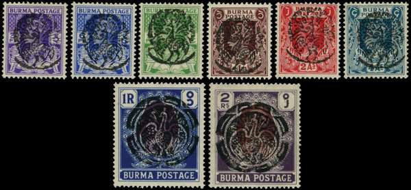 1942 KGVI set of eight to 2r brown and purple opt types 2 & 3 of Myaungmya, large part o.g. a fine assembly. SG J12-J19, £1000+