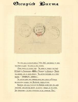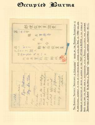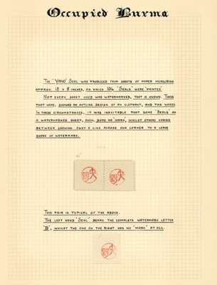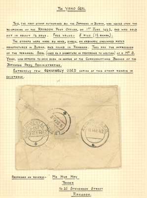 1942 'Yano' Seal collection on Senator pages including (1a) red unused pair and single, a strike of the seal on Burmese Postmaster 'Certificate of Employment', a single on piece sealing the envelope and single on cover with Rangoon and Experimental P.O. cds, generally fair to fine condition, a good range of this interesting and scarce seal. SG J45