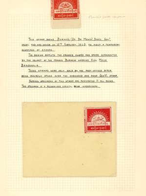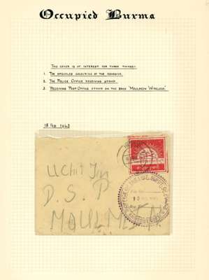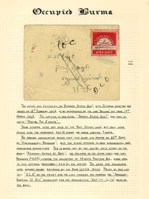 1943 5ct scarlet 'Burma State Crest' study on old Senator pages including one on cover from Insein to Moulmein with Police office Amherst Dist. mark in violet and Moulmein Wireless arrival cds for 10 Aug, unused imperf single on KGVI postal stationery envelope, one printed on both sides and one on cover with Rangoon Postage Due mark as the stamp was considered demonetized and taxed 10 cents, generally fair to fine condition. SG J72