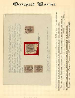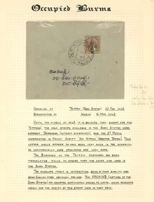 1943 Stamps of Perak, 5ct brown optd type 2 used in Shan States. We note unused and used (In Malaya) examples and one on paper used in Shan States, signed by Major Walker, and cover franked by 5ct tied by Tispaw cds for 18 FE 43, backstamped by Insein arrival for 16 MAR, generally fine condition, an interesting lot. SG J275