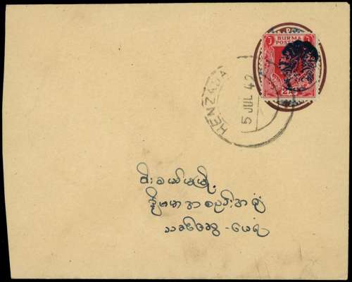 1942 KGVI 1a postal stationery envelope to Wakema additionally franked by 2a carmine opt type 5 of Henzada, tied by Henzada cds for 5 JUL, backstamped by Wakema cds for 20 JUL, a very neat and attractive cover. SG J31