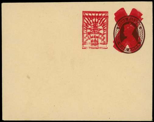 1942-45 KGVI 1a postal stationery envelope with DOUBLE IMPRESSION of Burma State Govt crest and Cross opt, very interesting and rare.
