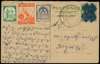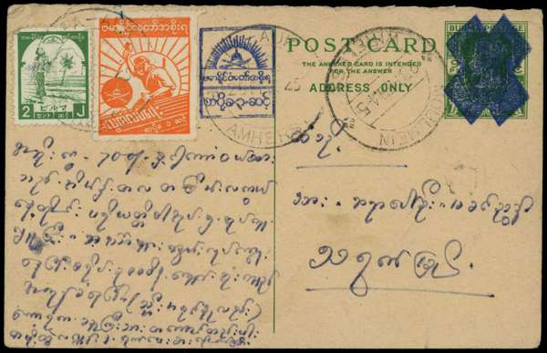 1945 KGVI 9p Postal Stationery card to Moulmein, franked at 6 cents rate by Burma State Govt crest h/s, Independence Day 1ct orange (rouletted) and Kolff 2ct yellow-green, tied by Pa-auk/ Amherst cds for 25 FEB with Moulmein Wireless d/s for 28 FEB, some wear at top still an attractive late use and multi-issue franking. SG J85-J89