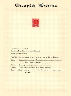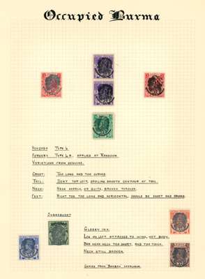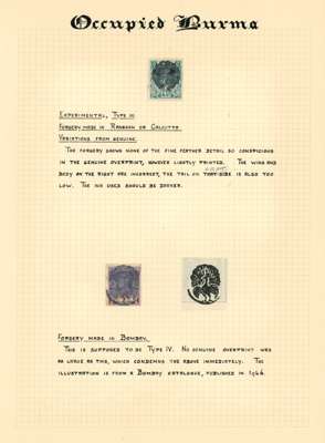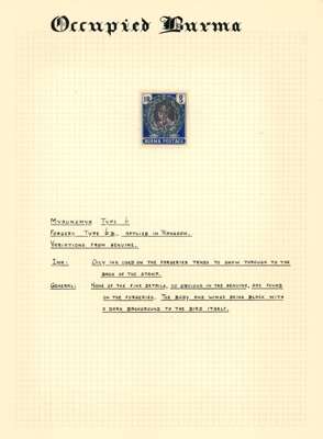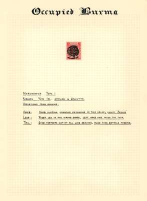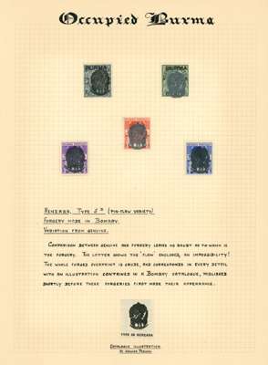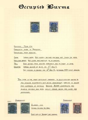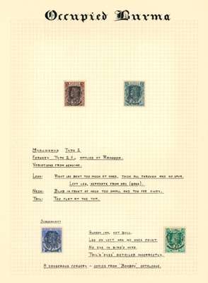 FORGERIES: 1940-50s detailed study of forged 'Peacock' Japanese Occupation opts on loose Senator pages, organised by type 1-6 with some copying the 'Pin flaw' variety, most examples marked underneath to denote their status as forgeries, generally fine condition, an invaluable resource for the specialist for these issues.