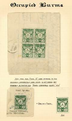 REVENUE: 1943-45 Rouletted 5ct green fiscal assortment including unused top marginal single and used single on piece and postally used block of four on commercial cover, possibly as a postage due with postmark illegible, fine condition, an interesting lot. McClellan J21