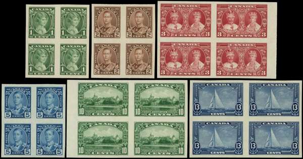 1935 Silver Jubilee set of 6 to 13c, in IMPERFORATE BLOCKS OF FOUR (the 3c and 10c respectively right and left marginal),...