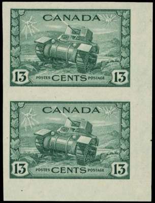 1942-48 War Effort 13c dull green 'Ram Tank', lower right corner IMPERFORATE vertical pair, very fine unmounted o.g. Only 50 pairs existed and desirable in this positional form. SG 384