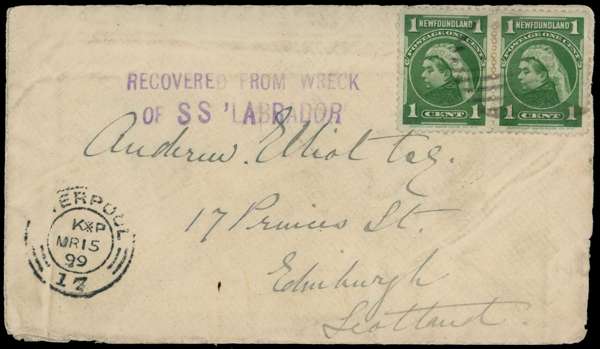 POSTAL HISTORY: 1899 cover to Edinburgh franked by 1ct green pair, salvaged from the wreck of SS Labrador which ran around off the coast of Scotland, bearing two lined RECOVERED FROM WRECK OF SS LABRADOR h/s in violet, with Liverpool transit mark for MR 15, backstamped by Sorting Tender Edinburgh mark for MR 16, very scarce as only a few of the 153 mail bags were recovered, which also remarkably saw no loss of life! SG 66