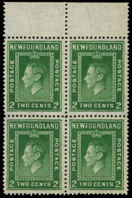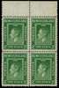1941-4 Second Resources 2ct green perf 12½ top marginal block of four, unmounted o.g., printed double, one albino. Light natural gum bends. SG 277 var