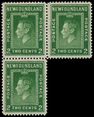1941-4 Second Resources 2ct green perf 12½ irregular 'block' of three, unmounted o.g., printed double, one albino. SG 277 var