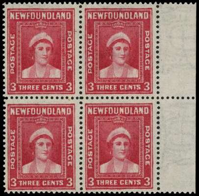 1941-4 Second Resources 3ct carmine perf 12½ right-marginal block of four, unmounted o.g., printed double, one albino. Light natural gum bends. SG 278 var