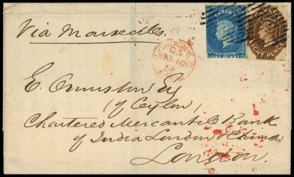 POSTAL HISTORY: 1859 wrapper to London 'Via Marseilles' franked by 1d blue and 8d brown, (with touching to clear margins), tied by oval of bars, with London arrival strike at left for NO 10, backstamped by Kandy Post Paid and Steamer Letter markings for OC 10, small split at top, still a very fine and attractive early Pence issue cover. SG 2-7