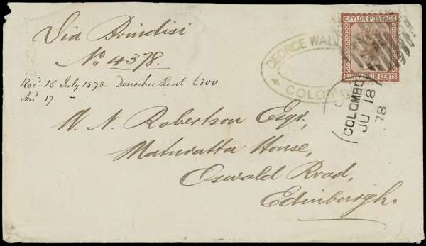 POSTAL HISTORY: 1878 cover to Edinburgh, franked with 64c red-brown QV issue, tied by Colombo duplex (18 JU 1878) and George Wall & Co. handstamp, endorsed "Via Brindisi", fine example of double UPU rate franking, scarce