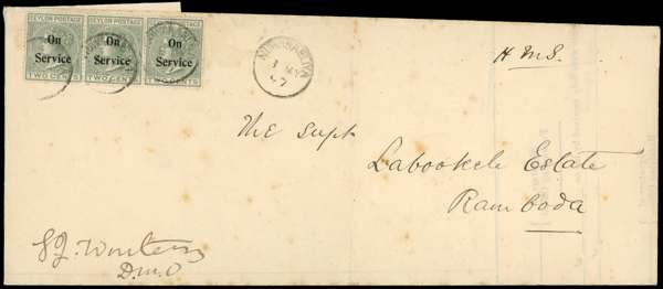 POSTAL HISTORY: 1880-1897 two items with better frankings: 1880 piece to the Governor, Sir W H Gregory with strip of five 4c grey (perf 14x12½) cancelled with 45 numeral, Nuwara-Eliya cds (17 MR 1880). 1897 official document with three 2c "On Service" optd, cancelled Nuwara-Eliya (8 MY 1897), endorsed "H M S", central vertical fold not affecting stamps, addressed to Ramboda, both scarce frankings