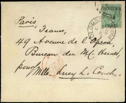 POSTAL HISTORY: 1883 to France with a 16c on 24c green surcharge tied by Colombo Paid duplex (13 JY 1883), tastefully restored, an attractive and rare item