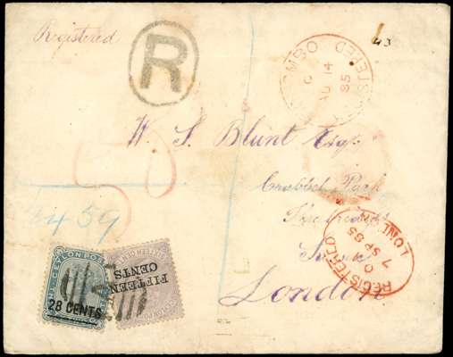 POSTAL HISTORY: 1885 registered cover from Colombo to Sussex with 28c on 32 slate surcharge and 15c on 16c pale violet cancelled with "A" numeral, Colombo Registered cds (14 AU 1885) and London arrival mark on face, Crawley cds on reverse, Rare franking