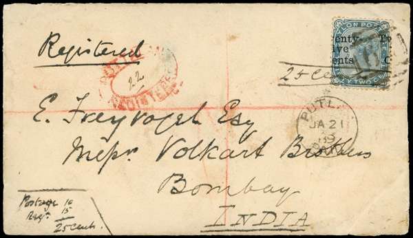 POSTAL HISTORY: 1889 registered cover to Bombay, India with 25c on 32c surcharge showing dramatic shift to the left, tied by "67" numeral, Putlam Paid cds on face (21 JA 1889), also rare oval Puttalam Registered handstamp, Putlam Post Office wax seal on reverse along with transit marks, fine