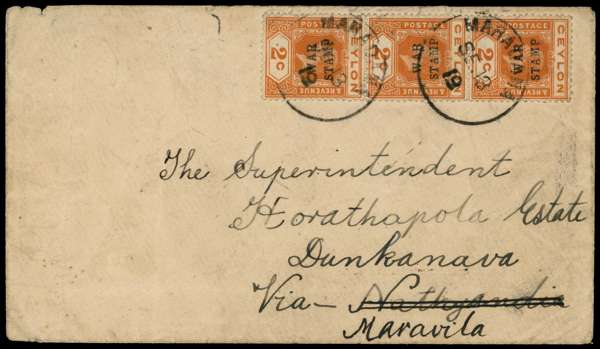 POSTAL HISTORY: 1919 envelope to Maravila franked by 2ct brown-orange optd WAR STAMP vertical strip of three, with variety OPT INVERTED, tied by Maravila cds for SE 13, backstamped with same marking, cover quite worn, still a scarce item. SG 330a