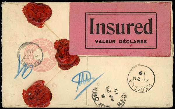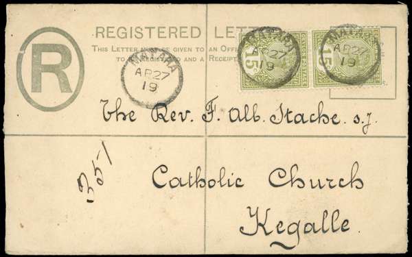 POSTAL HISTORY: 1919 Insured registered envelope with late use of pair of 15c sage-green QV issues cancelled Matara (27 AP 1919) addressed locally to Kegalle, wax seals and Insured label on reverse, the stamps paying the 25c insurance fee and 5c postage, ex Col. Stieg, fine