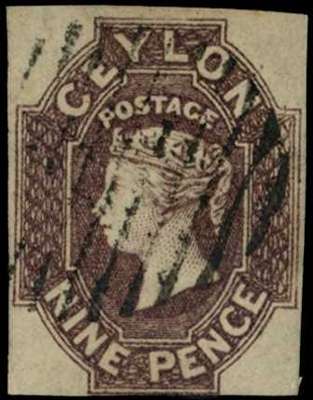 1857-59 9d purple-brown wmk star, imperforate with touching to clear margins, cancelled by oval of bars, still a very collectable example of this classic stamp. SG 8
