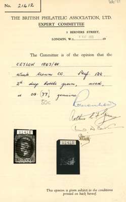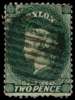 1863-66 2d bottle green, wmk CC, perf 12½, cancelled by oval of bars and manuscript, above average centring, a very fine example of this rare shade. BPA Certificate (1953) SG 50c