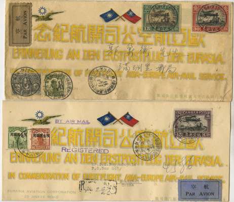 POSTAL HISTORY: 1931-1937 Eurasia Aviation Corp. first flight covers. Majority from the 1931 first flight Shanghai via Moscow to Europe: registered to Berlin, registered to Hamburg, registered to Shanghai etc. Also, a pair of 1937 first flight covers from the Peiping to Hong Kong flight. (6)