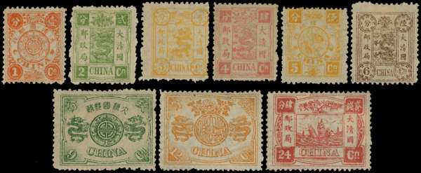 1894 60th Birthday of the Dowager Empress first printing, set of nine to 24ca rose-carmine, part o.g; some imperfections with 12ca & 24ca unused (no gum) and 6ca with light bend, still largely fine, a collectable example of this attractive and popular set. SG 16-24 Chan 22-30