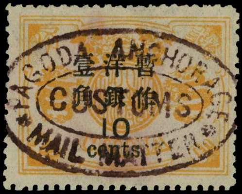 1897 Large figure surcharge (2½mm spacing) 10cts on 12ca orange-yellow Second Printing Empress Dowager, superbly struck by ''PAGODA ANCHORAGE CUSTOMS MAIL MATTER'' oval mark in brown, most attractive. SG 64